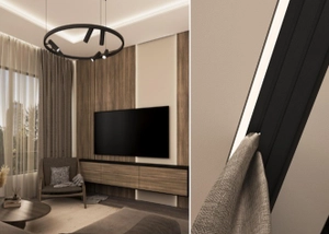 Профиль карниз изготовлен из алюминия, выкрашен в черный или белый цвет. Применяется дли формирования карниза для штор в нише. Можно использовать с подсветкой, установив светодиодную ленту.